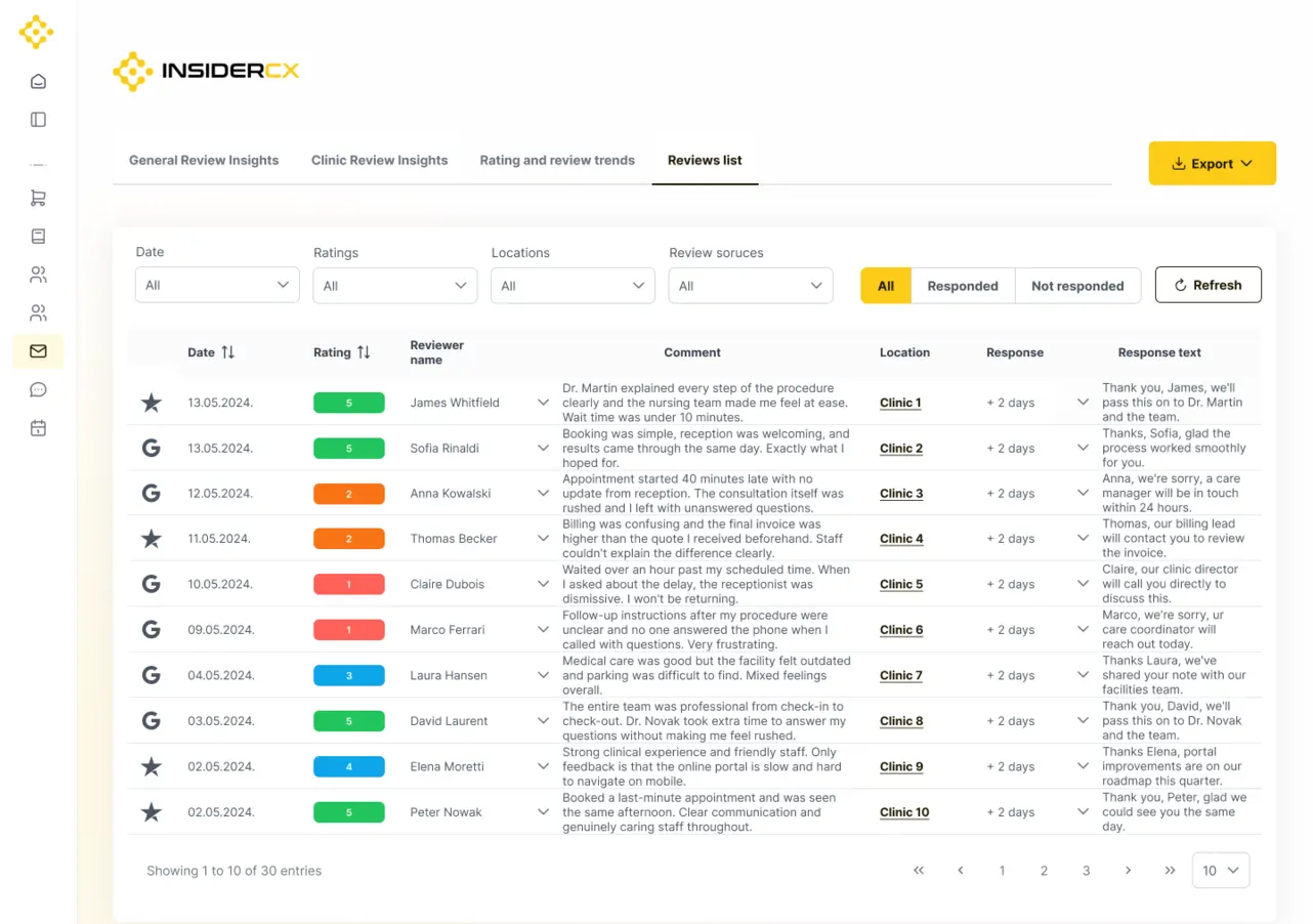 Implementing InsiderCX in our quality management process was a great decision, and their team supported us every step of the way. Once implemented, the communication with our clinic managers became more efficient and streamlined because we all had access to the same, real-time insights. It was also interesting to learn more about the preferences of different patient groups and locations.